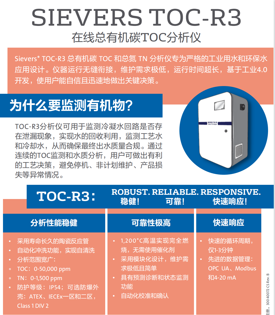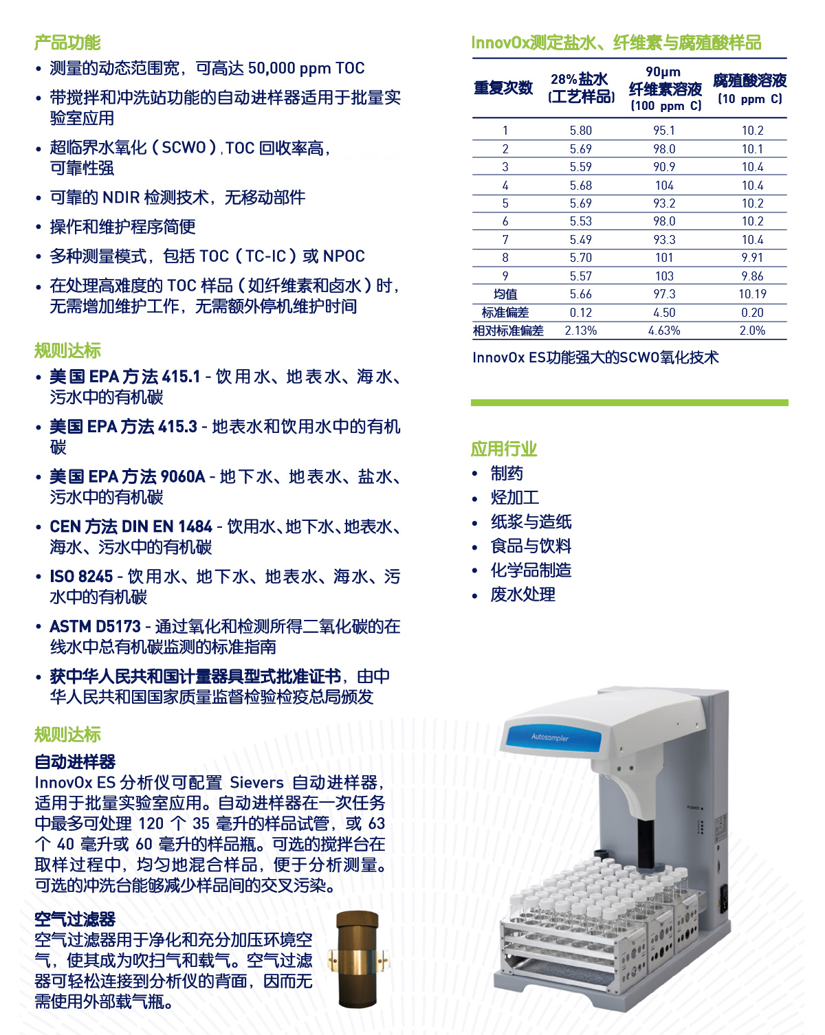 Thu, 18 Jun 2020 03:00:15 +0000http://www.jxcfbj.com/?post_type=tq_products&p=284Sievers nnovox總有機(jī)(TOC)分析儀,用于連續(xù)測(cè)水樣中的有機(jī)碳濃度,適用于測(cè)各種排入就出的水流,從汽冷凝水到污水,測(cè)量濃度范圍極廣。所有型號(hào)的 Innova分析儀都具有強(qiáng)大的樣品處理力,采用業(yè)界領(lǐng)先的起臨界水氧化(SCwO, Supercritical Water Oxidation)技術(shù)其維護(hù)和操作程序簡便,專為富有挑戰(zhàn)性的應(yīng)用而設(shè)計(jì),提供卓越的分析性與超長的工作時(shí)間。
